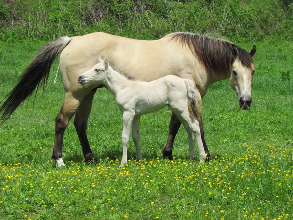 Buttercup is a dunskin mare. She is by our retired foundation stallion and out of our beloved old Foxy mare, who is Leo bred. Exposed to Rocky for 2026.