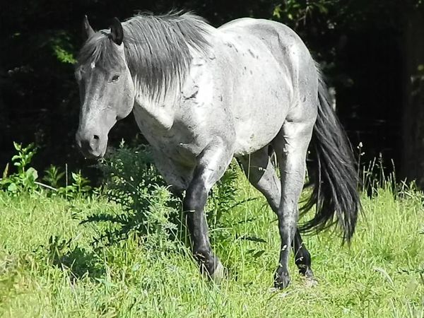 Rocky is our senior stallion, he truly is a rock for our operation. He is a 2002 bay roan stallion. He is a very calm, steady horse, and passes his amazing temperament on to his foals, along with his straight legs and solid feet. He has produced many dependable trail and working horses. Rocky carries the bloodlines of Joe Hancock and Driftwood. He is homozygous black and roan, all of his foals are black based and roan. He is color tested EE Aa RnRn. Five panel negative. His stud fee is $600. Mare care is $10 per day.
